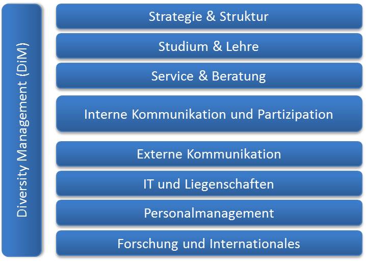 Definition der Handlungsfelder analog zum Diversity Audit „Vielfalt gestalten“ aber Ergänzung um die Bereiche „Forschung und Internationales“