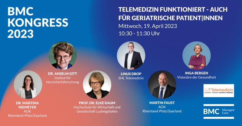 Der Jahreskongress 2023 des Bundesverbands Managed Care (BMC) befasst sich mit der Transformation des Gesundheitswesens und will einen Beitrag leisten, dies zu gestalten. Zum Themenfeld Telemedizin wird Frau Prof. Dr. Raum gemeinsam mit der Vorsitzenden des Vorstands der AOK Rheinland-Pfalz-Saarland, Dr. Martina Niemeyer, und dem dortigen Leiter Rehabilitative Versorgung, Martin Faust B.Sc. GiP, ein innovatives Projekt im Bereich geriatrische Versorgung vorstellen und diskutieren. Weitere Informationen zum Kongress finden Sie hier: https://bmckongress.de/