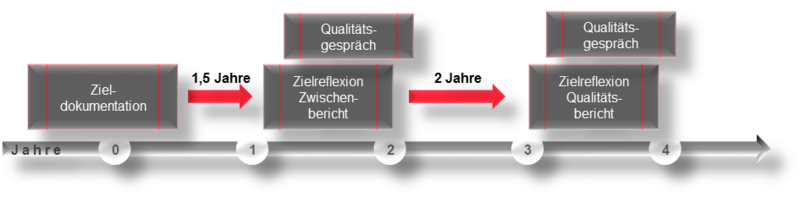 Die zentralen Instrumente der Qualitätssicherung und -entwicklung, das sind die Zieldokumentationen, die Zwischen- bzw. Qualitätsberichte sowie die Qualitätsgespräche, sind inhaltlich aufeinander abgestimmt. Sie werden daher in einer zeitlichen Abfolge erstellt. Eine inhaltliche und zeitliche Abstimmung erfolgt hierbei nicht nur in den einzelnen Einheiten (wie Studiengang, Fachbereich oder Abteilung), sondern ggf. auch zwischen den Einheiten.