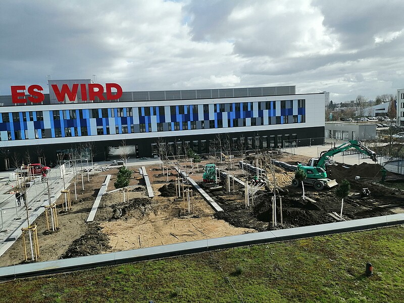Von langer Hand geplant und nun weitgehend seiner neuen Bestimmung übergeben: Der Neubau unseres Gebäudes C ist seit dem Spatenstich im November 2019 sichtlich vorangeschritten und seit Februar 2024 größtenteils bezugsfertig. Mit drei Geschossen und einer Ausdehnung von 45 x 125 m bietet der Neubau eine Nutzungsfläche von knapp 14.000 m2 und bereits jetzt Raum für die vier Fachbereiche der Hochschule und Serviceeinrichtungen wie das StudierendenServiceCenter, das Bafög-Amt oder das International Office. Daneben wartet der Neubau auch mit zahlreichen Vorlesungs-, Lehr- und Gruppenarbeitsräumen für die Studierenden auf. Die neue Bibliothek im EG des Neubaus öffnet im Mai ihre Pforten und führt die bisherigen Bibliotheksräume des B-Gebäudes und des Fachbereichs Sozial- und Gesundheitswesens in der Maxstraße zusammen. Auch eine großzügige Mensa und Cafeteria finden im EG des Neubaus Platz und versorgen spätestens ab dem Wintersemester 2024/2025 Studierende, Lehrende, Mitarbeiterschaft und externe Gäste kulinarisch. Das Außengelände zwischen den Bestandsbauten A und B und dem neu gebauten Gebäude C nimmt ebenfalls sichtbar Gestalt an: Zahlreiche Neupflanzungen und Steinarbeiten lassen jetzt schon erahnen, dass hier ein schön gestalteter Außenbereich entsteht, der zum Verweilen und Arbeiten im Schatten der Bäume einlädt.
