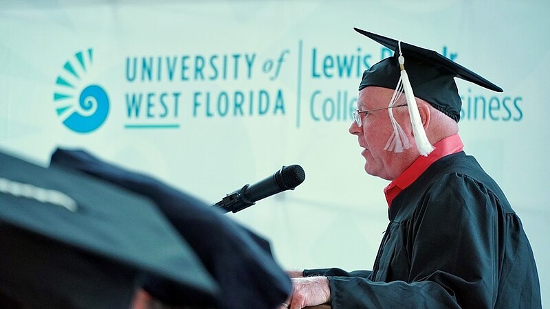 Nach dem Betreten des Atriums begrüßte Melissa Brode, stellvertretende Dekanin des College of Business an der UWF, die Gäste. Im Publikum befanden sich fast 70 Gäste, die eigens in die USA gereist waren, um an der Abschlussfeier in Pensacola teilzunehmen.