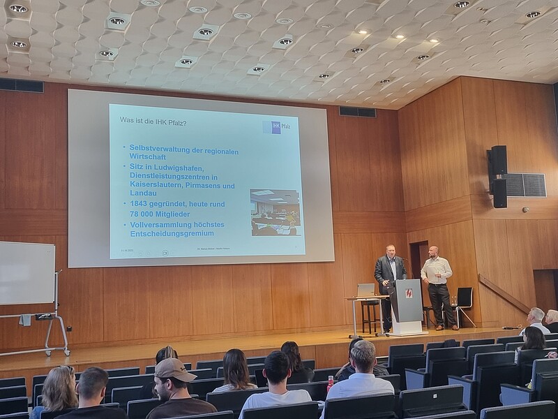 Dr. Marius Melzer und Martin Holaus stellten die Aufgaben der IHK Pfalz im Allgemeinen und speziell für Gründerinnen und Gründer im Nebenerwerb oder während des Studiums vor. Die Palette an Unterstützungsangeboten reicht von der klassischen Existenzgründungsberatung über Sprechtage zu juristischen, steuerrechtlichen oder patentrechtlichen Fragen bis hin zu Beratung zu Förderprogrammen und ein großes Netzwerk.