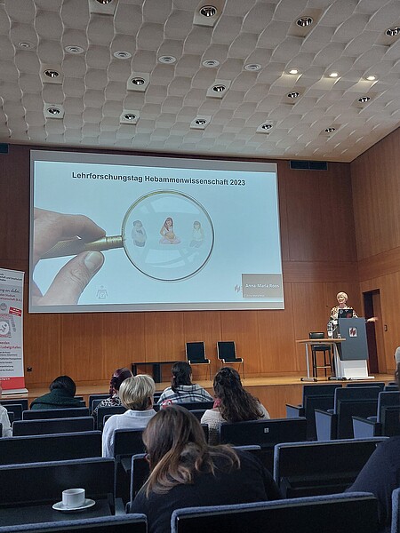 Am Samstag, den 25.11.2023 fand der alljährliche Lehrforschungstag der Hebammenwissenschaft in der Hochschule für Wirtschaft und Gesellschaft Ludwigshafen (HWG LU) statt. Dabei waren sowohl Studierende, Hebammen und Praxisanleiterinnen aus den kooperierenden Kliniken und der Freiberuflichkeit, als auch das Lehr-Team der Hebammenwissenschaft. Referiert haben Studierende aus dem berufsbegleitendem Studiengang B. Sc. Hebammenwesen. In Kleingruppen haben sie sich im Rahmen eines Seminars, das sich über drei Semester erstreckte, damit befasst, ein Forschungsprojekt von Grund auf die Beine zu stellen. Mit ihren Projekten tragen sie dazu bei, die Disziplin Hebammenwissenschaft weiter zu entwickeln und Forschungsfelder für zukünftige wissenschaftliche Arbeiten aufzuweisen.