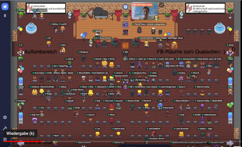 Wie in den drei Semestern zuvor erfolgte gestern auch der Start ins Sommersemester 2022 an der HWG LU Corona-bedingt virtuell. Statt eines Live-Streams erwartete die neuen Studierenden jedoch dieses Mal eine Begrüßung in einem interaktiven Online-Tool, in dem sich alle Teilnehmenden in virtuellen Räumlichkeiten als Avatare frei bewegen, miteinander sprechen und agieren konnten. Vom Podium in der eigens designten Aula begrüßten die beiden Vizepräsidentinnen Prof. Dr. Edith Rüger-Muck und Prof. Dr. Ellen Bareis gemeinsam mit Kanzlerin Carolin Nöhrbaß die (nach vorläufigen Zahlen) rund 350 neuen Studierenden im Namen der Hochschule. Ludwighafens Oberbürgermeisterin Jutta Steinruck und Vertrauensdozentin Prof. Dr. Birgit Angermayer überbrachten ihre Grüße und Wünsche zum Semesterstart per eingespielter Videobotschaft. Die Studierenden Mai-Trinh Vu und Rosario Celona stellten den neuen Kommiliton*innen die Hochschule vor; anschließend skizzierten der allgemeine Studierendenausschluss AStA und das Studierendenparlament StuPa ihre Handlungsfelder und Angebote. Im Anschluss an die zentrale Begrüßung konnten die Erstsemester sich in andere Räume bewegen, mit AStA und StuPa in näheren Kontakt kommen, noch offene Fragen beim StudierendenServiceCenter klären, das Beratungsangebot von Studierendenwerk Vorderpfalz und Hochschulseelsorge kennenlernen oder mit ihren künftigen Mitstudierenden ins Gespräch gehen. Über individuell ansteuerbare Videoeinspieler und Infografiken konnten sich die Erstsemester darüber hinaus über das umfassende Angebot des International Office informieren, den Campus virtuell erkunden oder den Neubau in Augenschein nehmen.