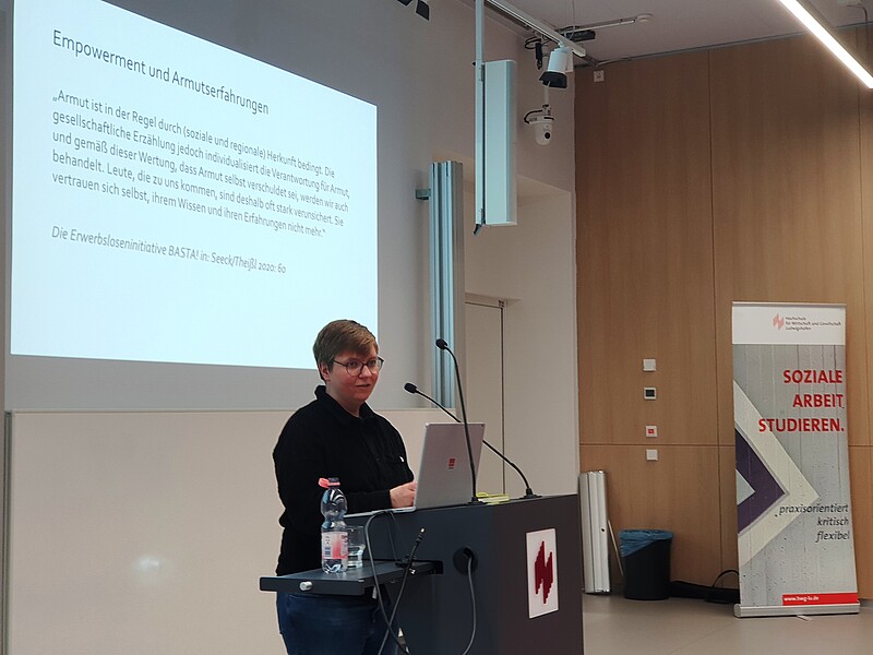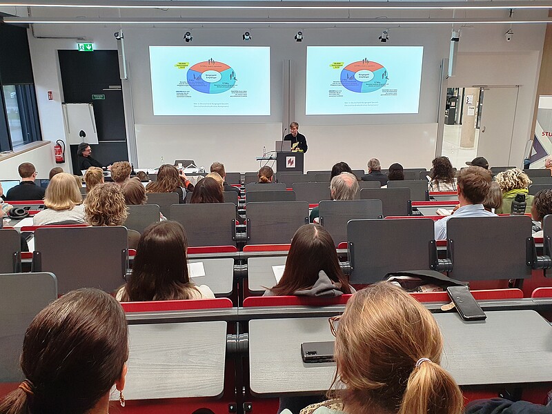 Mit einem gut gefüllten Auditorium im C-Gebäude begann am vergangenen Donnerstagabend, 27. März, der Auftakt zur zweiten Staffel der Veranstaltungsreihe "Soziale Fragen" auf dem HWG-Campus. In Kooperation mit Professorin Immacolata Amodeo vom Ernst-Bloch-Zentrum hatten die Professoren Peter Rahn und Jörg Reitzig vom Fachbereich Sozial- und Gesundheitswesen die Reihe im vergangenen Wintersemester ins Leben gerufen. Am Beginn des Sommersemesters startete die Fortsetzung nun mit einem Vortrag von Francis Seeck, Professor*in für Soziale Arbeit mit Schwerpunkt Demokratie- und Menschenrechtsbildung an der Technischen Hochschule Nürnberg. Im Mittelpunkt des Vortrags, bei dem das Publikum mittels Mentimeterabfragen und Murmelgruppen partizipativ einbezogen wurde, standen die Analyse klassistischer Abwertungen und empirische Befunde klassenmäßiger Distinktionsmerkmale, etwa hinsichtlich des unterschiedlichen Zugangs zu Bildung. Seeck verwies auf Ergebnisse der internationalen Grundschule-Lese-Untersuchung (IGLU), wonach Kindern aus Akademikerhaushalten von Seiten ihrer Lehrkräfte doppelt so häufig ein Gymnasialempfehlung prognostiziert wird, wie Kindern aus Arbeiterfamilien und letztere zudem für eine solche Empfehlung eine deutlich höhere Lesekompetenzleistung erbringen müssten. So erlangten von hundert Nichtakademikerkindern schließlich nur 20 einen Bachelorabschluss - bei Akademikern sind es 65. Und wenn derzeit in Politikerstatements zu Bürgergeldbeziehenden häufig von Totalverweigerern gesprochen wird, werde übersehen, dass dies lediglich auf ca 16.000 Bezieher:innen von Bürgergeld zutreffe, während 1,8 Mio. Leistungsbezieher Kinder und Jugendliche sind. Weitere 2 Mio. stehen dem Arbeitsmarkt nicht für weitere Tätigkeiten zur Verfügung, weil sie alleinerziehend sind, Angehörige pflegen oder aber als sogenannte 'Aufstocker' von ihrer Erwerbsarbeit nicht auskömmlich existieren können. Dabei sei der Mindestlohn mit einem Plus von rund 35 Prozent in den zurückliegenden Jahren deutlich stärker gestiegen als das Bürgergeld mit ungefähr 26 Prozent.