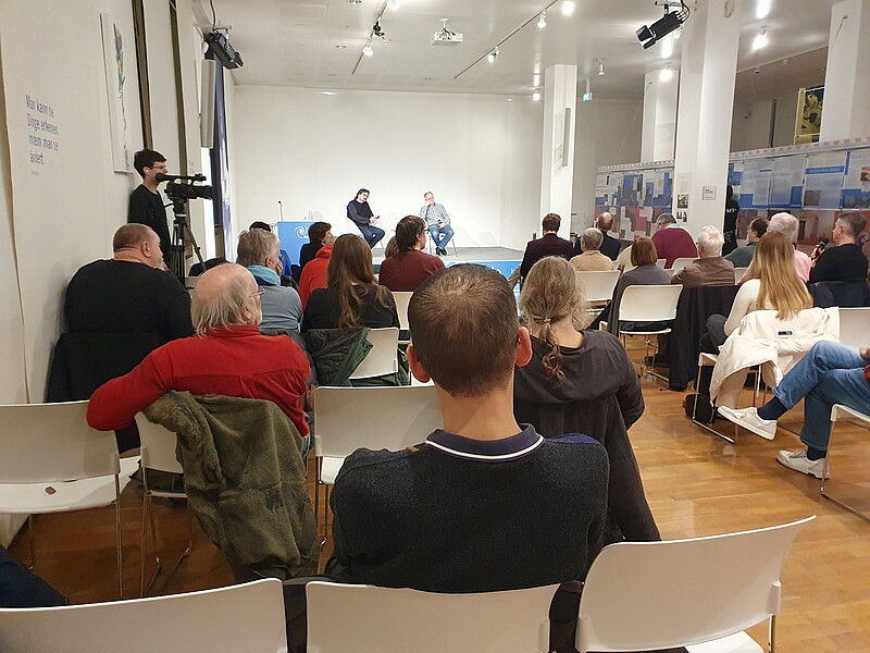 Die anschließende Diskussion, die von Prof. Peter Rahn (HWG) moderiert wurde, verlief angeregt. Die zahlreichen Nachfragen und Kommentare aus dem Publikum bezogen sich ebenso auf seine Erfahrungen in der Konfrontation mit der Justiz und mögliche persönliche Risiken oder auf die Rolle der Kirchen und der Öffentlichkeit sowie auf seine Überlegungen, was die ältere von der jüngeren Generation lernen könne. Der Direktorin des Bloch-Zentrums Prof. Amodeo ist es zu verdanken, dass die Veranstaltung durch den Offenen-Kanal Ludwigshafen aufgezeichnet wurde und so auch für diejenigen, die nicht persönlich teilnehmen konnten, in Kürze auf dem Youtube-Kanal des Ernst-Bloch-Zentrums (www.youtube.com/@ernst-bloch-zentrum4321/videos) verfügbar sein wird.