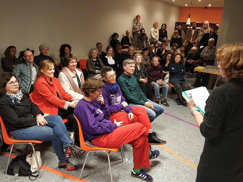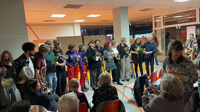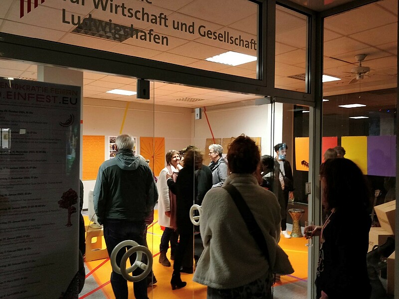 Auf der Basis einer seit Sommer bestehenden Kooperation zwischen der HWG LU und dem Verein „Kultur-Rhein-Neckar e.V.“ wurde dort am vergangenen Montagabend (28.10.2024) die Weiterführung der Veranstaltungsreihe „DEMOKRATIE FEIERN - D.EINFEST“ eröffnet. Vor dem Hintergrund zunehmend rechtspopulistischer bis rechtsextremer gesellschaftlicher Tendenzen und wachsender Sorge um die Bedrohung der Demokratie hatten im März 2024 über 200 Kulturaktive in der Metropolregion Rhein-Neckar eine von Kultur-Rhein-Neckar e.V. initiierte Erklärung „Für eine starke Demokratie“ unterzeichnet. Seither haben 22 künstlerische Aktionen an öffentlichen Plätzen in Ludwigshafen stattgefunden.
