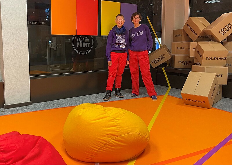Am Eröffnungsabend strahlte das Social Innovation Lab in leuchtenden Farben in die Fußgängerzone hinaus, die Künstlerinnen Sabine Amelung und Michaela Jäkel vom Kollektiv JaaH hatten gemeinsam mit Filmemacher Klaus Woller den Raum mittels einer begehbaren Installation, welche die bis dato stattgefundenen künstlerischen Aktionen „DEMOKRATIE FEIERN - D.EINFEST“ dokumentiert, eindrucksvoll in Szene gesetzt. Der Einladung zur Eröffnungsfeier gefolgt waren zahlreiche Kulturaktive aus der Region sowie etliche Akteur*innen der Stadt. Die Hochschule war nicht nur mit Hochschulleitung und Lehrenden, sondern auch mit Studierenden repräsentiert und dazu kamen - die im SoIL immer besonders willkommenen - Bewohner*innen aus der unmittelbaren Nachbarschaft wie auch ‚zufällig‘ vorbeiflanierende Passant*innen.