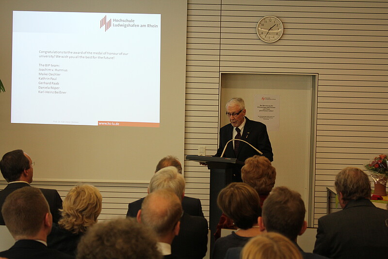 In seiner Dankesrede blickte auch Professor William Murray voll Freude und Stolz auf „the amazing time” seiner Lehrtätigkeit in Ludwigshafen und das Business and International Program (BIP) zurück: „Since I am the longest serving BiP guest professor it is my unique opportunity to make some comments about the development of the program and its students over the years. What a joy it has been to get to know these students and follow along with them as their careers and lives unfold! This is an excellent program; well-designed and extremely well managed. I am very proud to tell my colleagues worldwide of my association with it. What a joy it was each year to get to return to my second home, meet the new (to me) class, get to know them, and hear of the successes of those alumni that keep in touch.”
