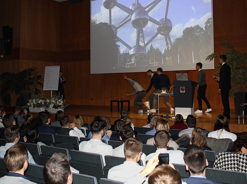 Gemäß jahrelanger Tradition durften wir auch den Präsidenten der Hochschule, Professor Dr. Mudra, willkommen heißen, der den Abend mit einer motivierenden Rede im Zeichen des interkulturellen Austausches eröffnete. Das Motto der Veranstaltung lautete „Die Höhle der BIPs“, eine Abwandlung der Unterhaltungsshow „Die Höhle der Löwen“. Die Moderatoren Sascha Dietz und Adrian Pohlmann nahmen die Gäste mit auf eine Reise mit elf Zwischenstopps. Auch sollten die Löwen der Show nicht fehlen: Je drei Studierende der Nachfolgejahrgänge durften auf die Bühne und hatten die Aufgabe, besonders interessante Fakten und Anekdoten aus den Präsentierenden heraus zu kitzeln.